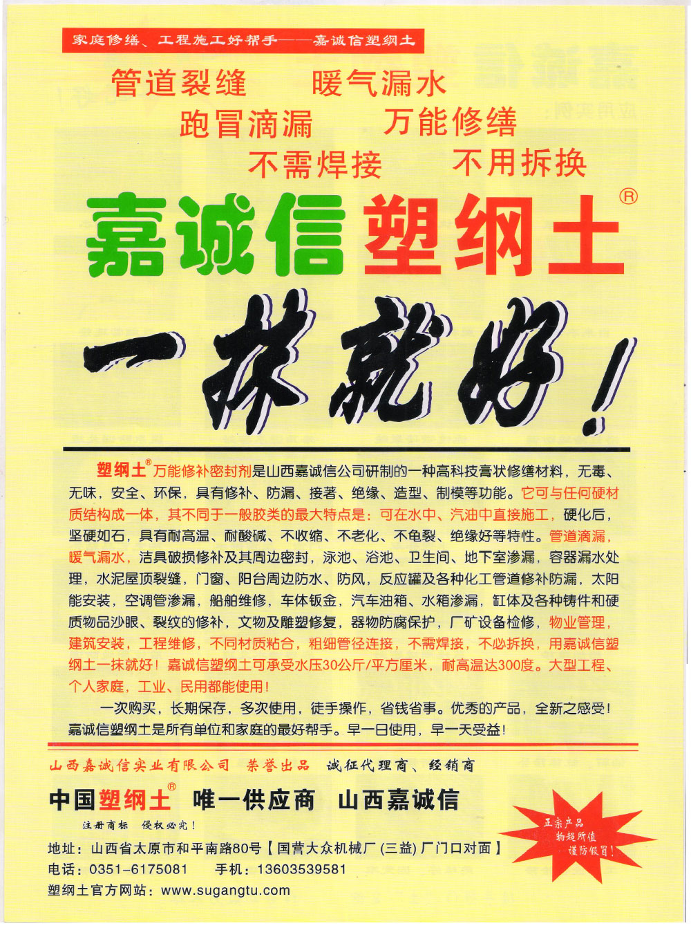 山西嘉誠信實業有限公司多年來,一直致力于“塑綱土”(國家注冊商標)修補密封劑在我國的推廣、應用和研究,用戶遍布各地。長期以來,山西嘉誠信實業有限公司投入大量人力、物力和財力,通過各種媒體及其它方式對”塑綱土”品牌進行市場推廣和大力宣傳,使“塑綱土”品牌在業內享有相當知名度和影響力,深受廣大用戶的青睞和厚愛。
